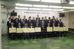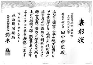 昨年度当社が施工した 「一般国道452号 三笠市 上桂沢改良工事」 が優良工事として認定され、 この度の表彰をいただくことができました。