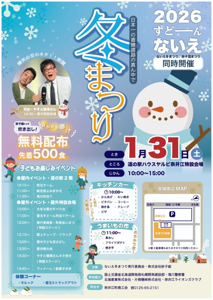 今年度は、ないえ冬まつりと砂子雪まつりを同時開催し、新たに『冬まつり』として実施いたします。