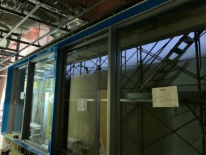 内装工事では現在サッシのガラスの取り付け工事がありました。