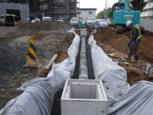 そこに集水桝やトレンチ管(雨水が地下に流れるようにするための物です)を敷設、