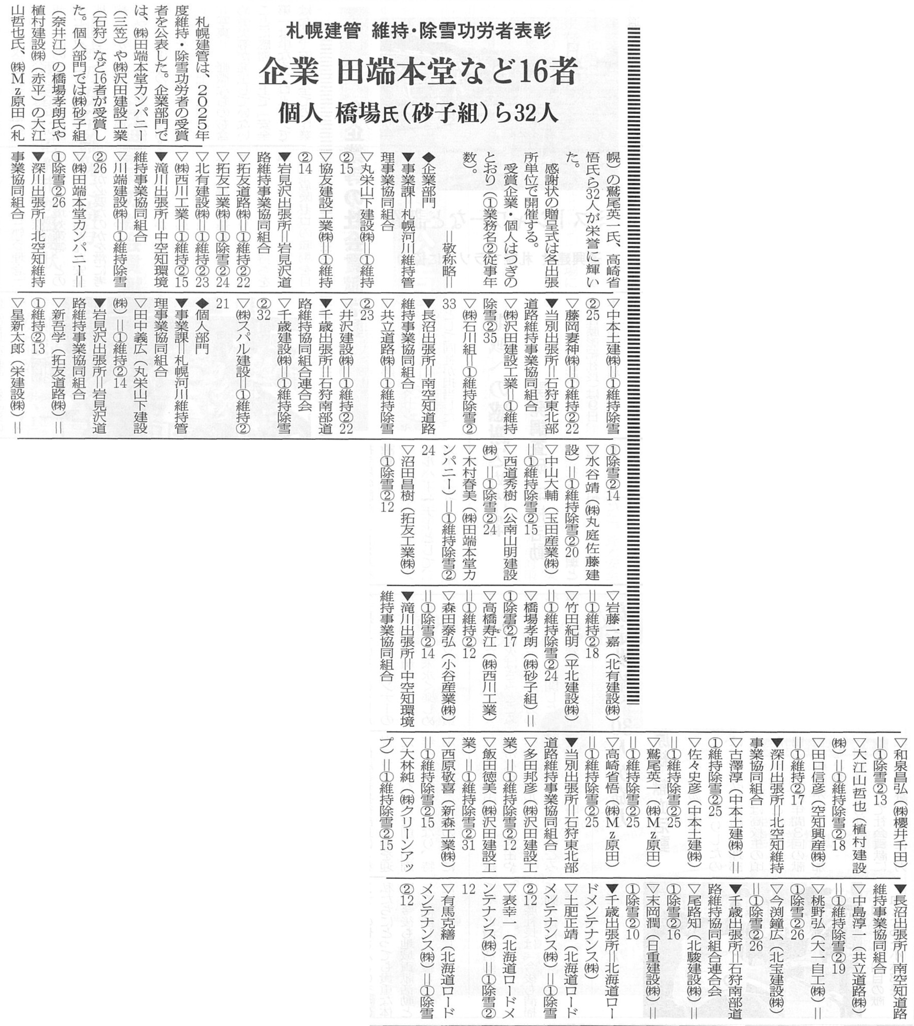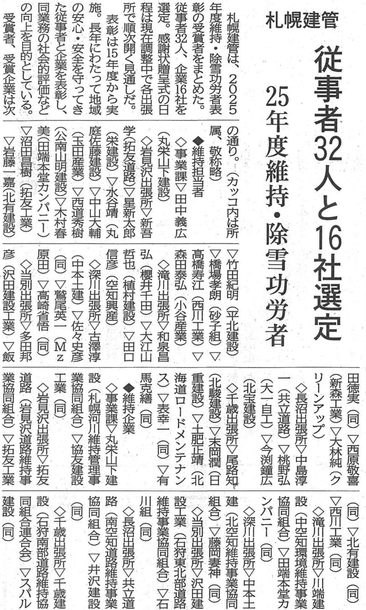 以上2紙に、「2025年度維持・除雪功労者表彰」に関する記事が掲載されました。