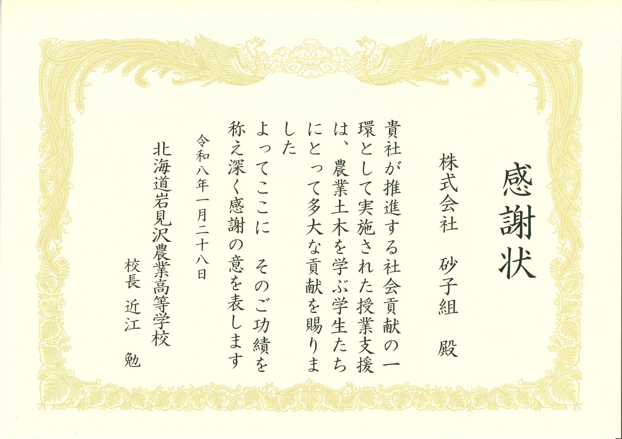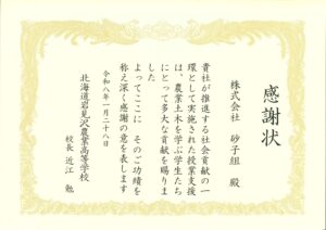 当社は、空知建設業協会の会員企業として連携授業に協力し、講師を務めさせていただきました。 こうした連携授業への協力に対し、岩見沢農業高校より感謝状をいただきました。