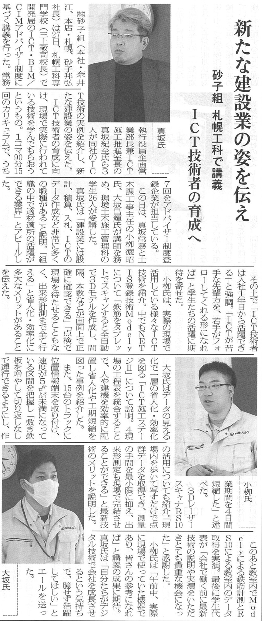 2025年12月1日付 北海道通信に、 札幌工科専門学校での講義に関する記事が掲載されました。