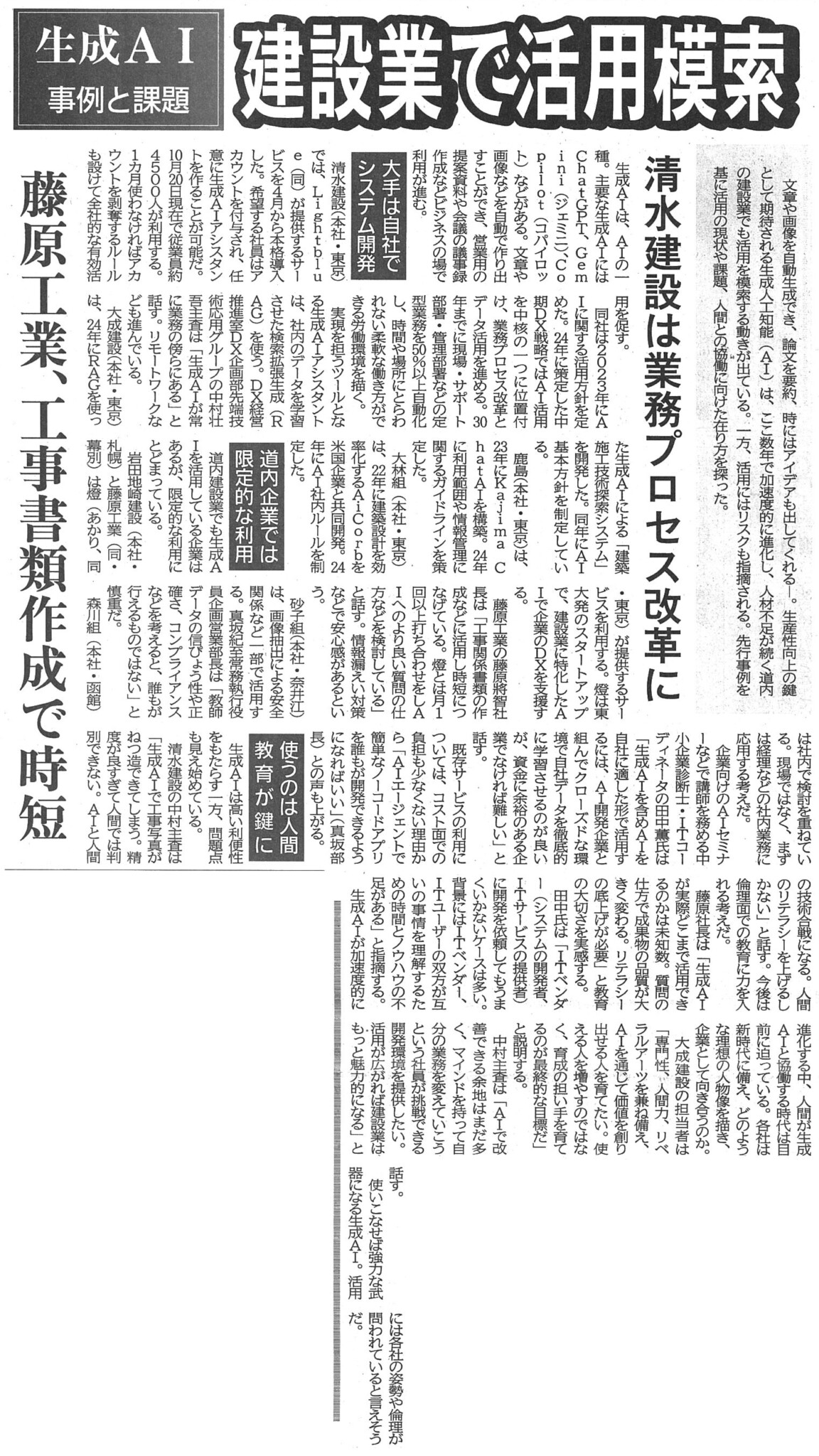2025年11月11日付 北海道建設新聞に、 建設業における生成AI活用に関する記事が掲載されました。