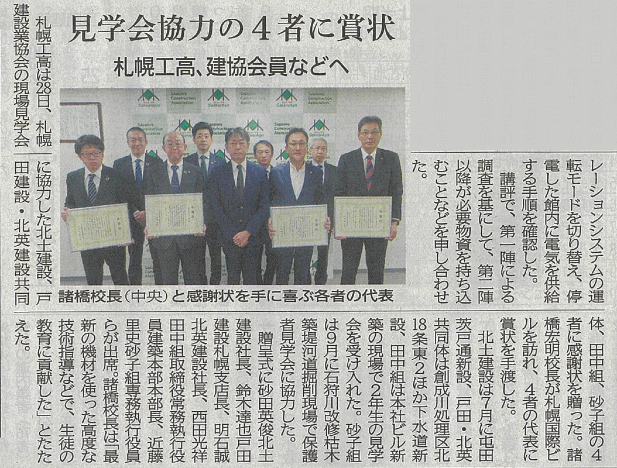 2025年10月31日付 北海道建設新聞に、 見学会協力に対する感謝状贈呈の記事が掲載されました。