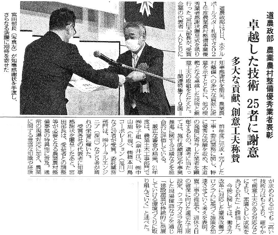 以上2紙に 2021年度 農業農村整備事業優秀業者表彰に関する 記事が掲載されました。